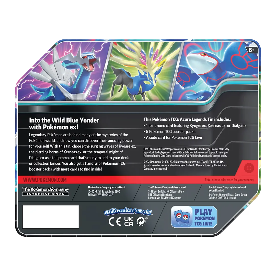 Legendary Pokémon are behind many of the mysteries of the Pokémon world, and now you can discover their amazing power for yourself! With this tin, choose the surging waves of Kyogre ex, the piercing horns of Xerneas ex, or the temporal might of Dialga ex as a foil promo card that’s ready to add to your deck or collection binder. You also get a handful of Pokémon TCG booster packs with more cards to find inside!