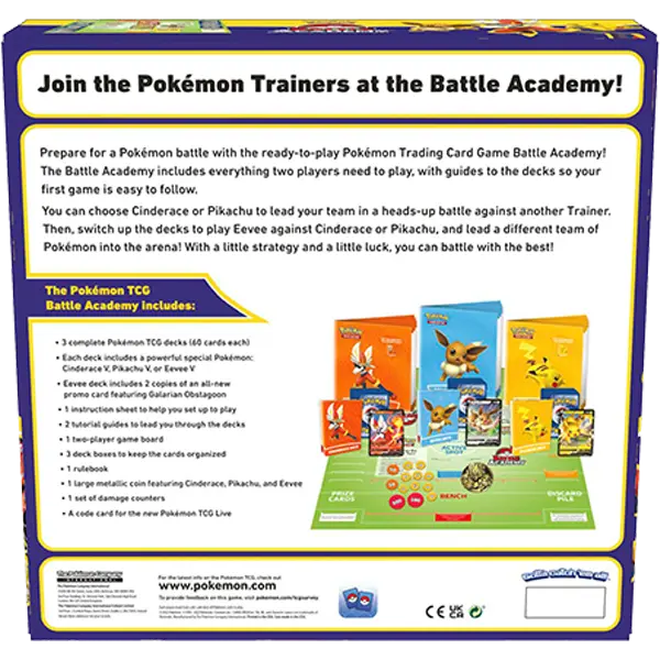 Prepare for a Pok mon battle with the ready-to-play Pok mon Trading Card Game Battle Academy! The Battle Academy includes everything two players need to play, with guides to the decks so your first game is easy to follow. You can choose Cinderace or Pikachu to lead your team in a heads-up battle against another Trainer. Then, switch up the decks to play Eevee against Cinderace or Pikachu, and lead a different team of Pok mon into the arena! With a little strategy and a little luck, you can battle with the best!