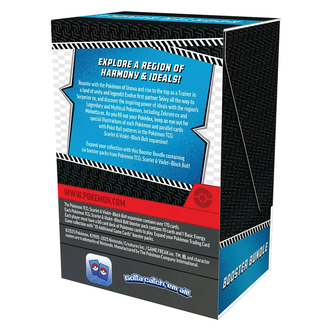 Reunite with the Pokémon of Unova and rise to the top as a Trainer in a land of unity and legends! Evolve first partner Snivy all the way to Serperior ex, and discover the inspiring power of ideals with the region’s Legendary and Mythical Pokémon, including Zekrom ex and Meloetta ex. As you fill out your Pokédex, keep an eye out for special illustrations of each Pokémon and parallel cards with Poké Ball patterns in the Pokémon TCG: Scarlet & Violet—Black Bolt expansion!