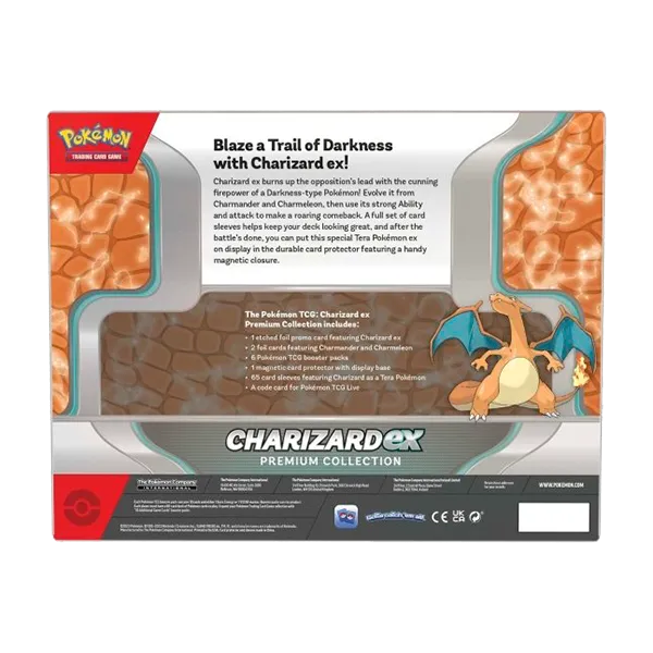 Blaze a Trail of Darkness with Charizard ex! Charizard ex burns up the oppositions lead with the cunning firepower of a Darkness-type Pokemon! Evolve it from Charmander and Charmeleon, then use its strong Ability and attack to make a roaring comeback. A full set of card sleeves helps keep your deck looking great, and after the battles done, you can put this special Tera Pokemon ex on display in the durable card protector featuring a handy magnetic closure.