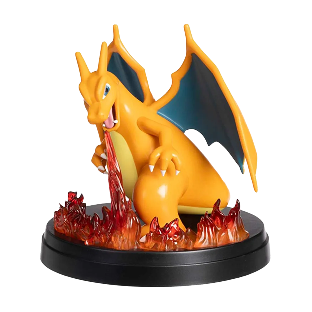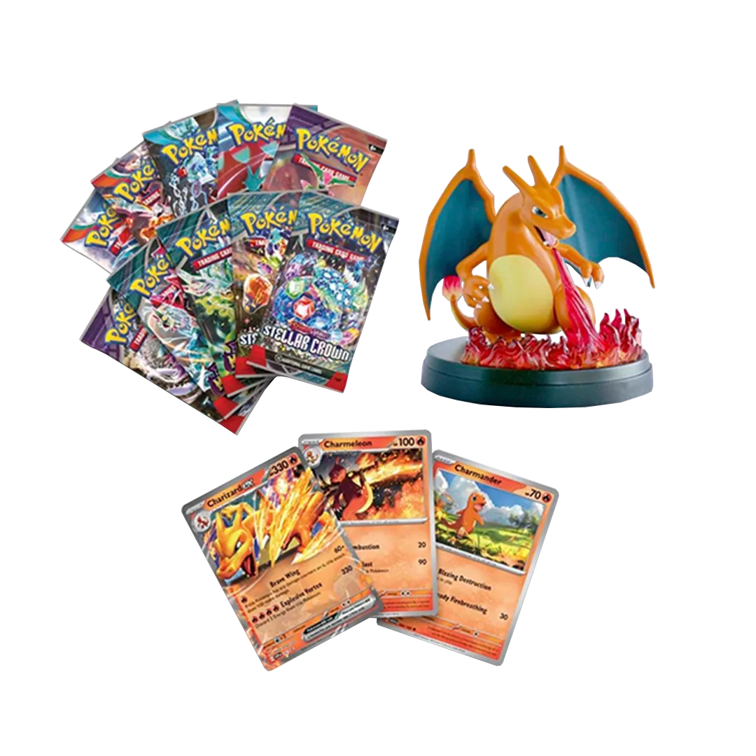 With explosive attacks and huge HP, Charizard ex has a commanding presence on the battlefield! Bring that burning tenacity to life on your desk, bookcase, or nightstand with an awesome Charizard figure featuring translucent fire effects to show off a favorite card—like the foil Charmander, Charmeleon, or Charizard ex you also get in this collection! Even more fun awaits in a stack of 10 booster packs from different Pokémon TCG expansions.