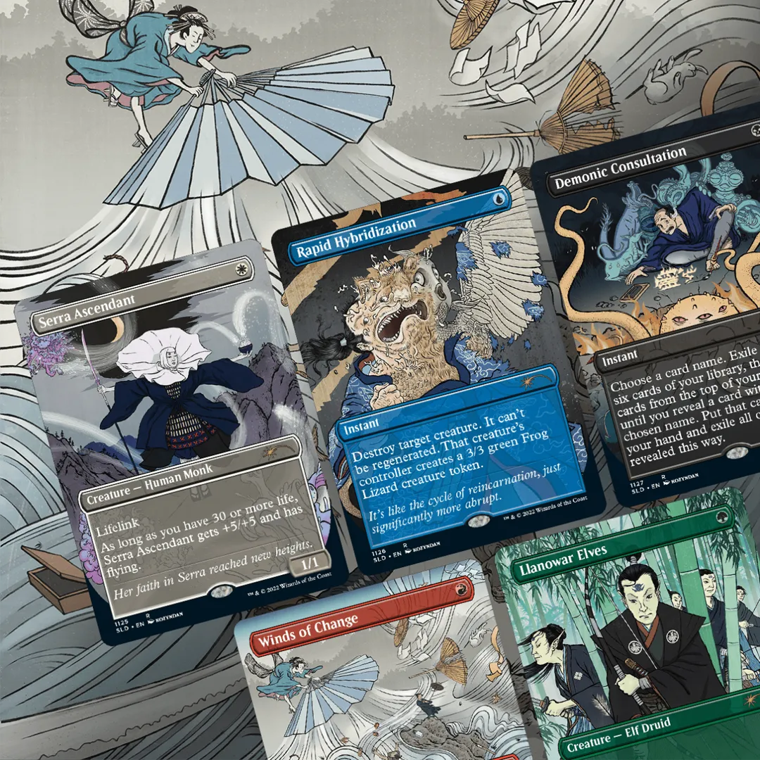 In Kozyndan’s second Secret Lair drop, the husband-and-wife team turned their design eyes toward an assortment of classic cards in Magic’s catalog. Pulling undeniable influence from traditional Japanese art, the duo stuns once again with new imaginings of Llanowar Elves and Serra Ascendant, to name a few. If you’re looking to make an impression when you slam down Winds of Change, you’re in exactly the right place.