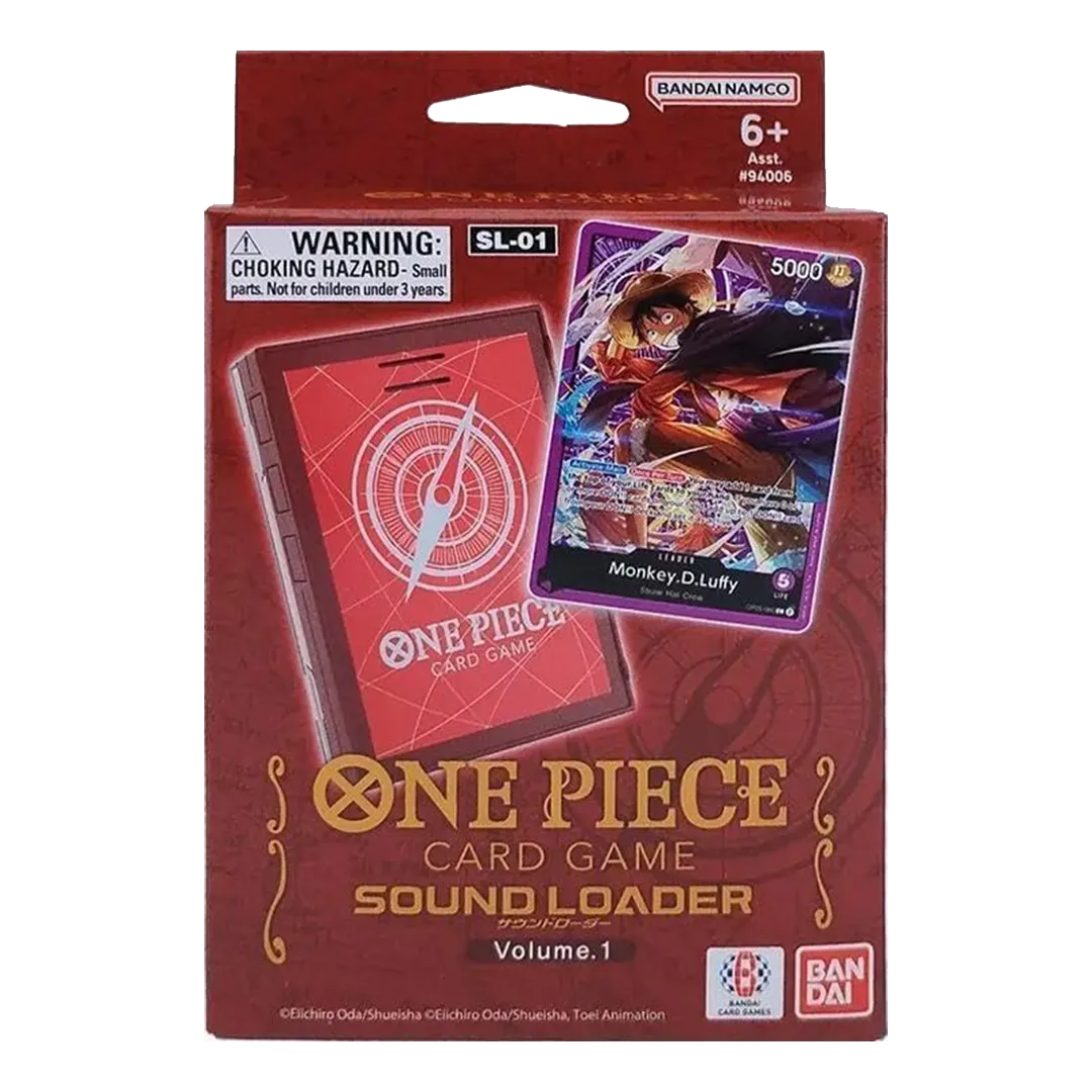 The loader fits into the official card cases and can store one ONE PIECE card. By pressing the BGM button on the side, “Cornered” plays from the show and character sounds are activated during play actions enhancing your game play experience!