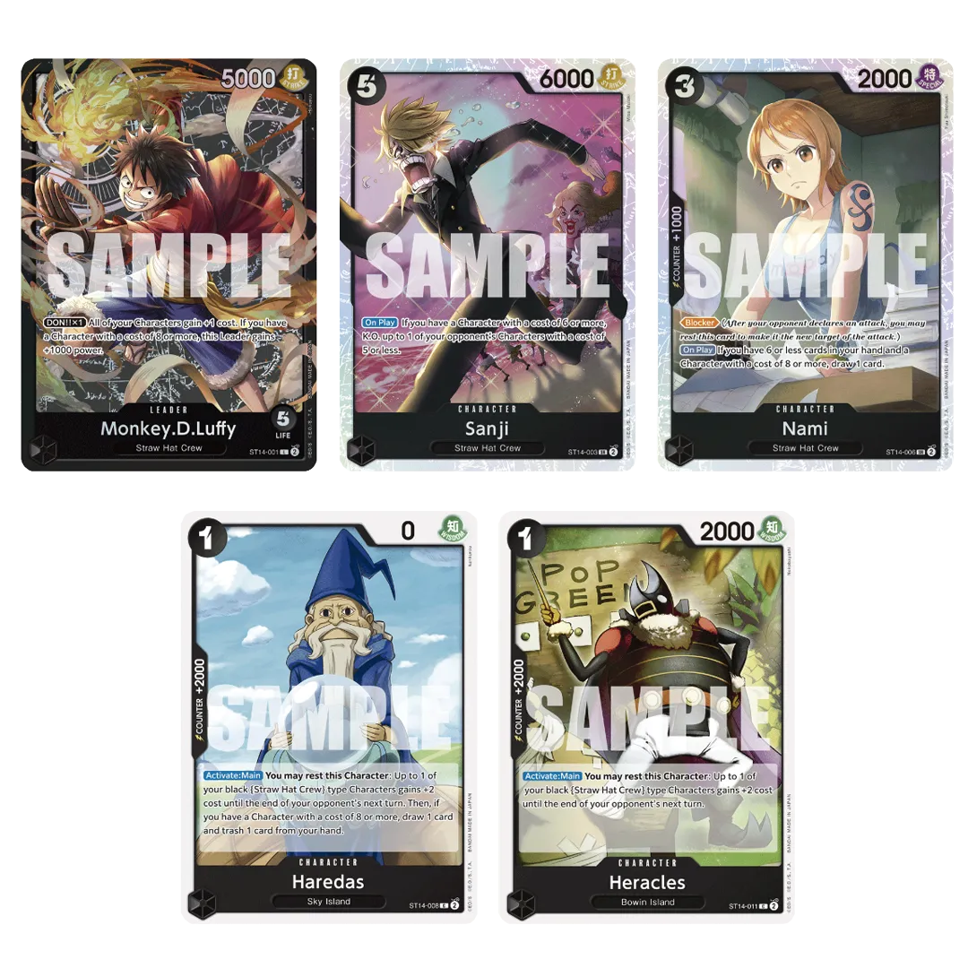 This deck showcases the Straw Hat Crew and their two years of individual training following the Summit War! In addition to members of the Straw Hat Crew, this deck introduces new Characters, such as Haredas and Heracles!