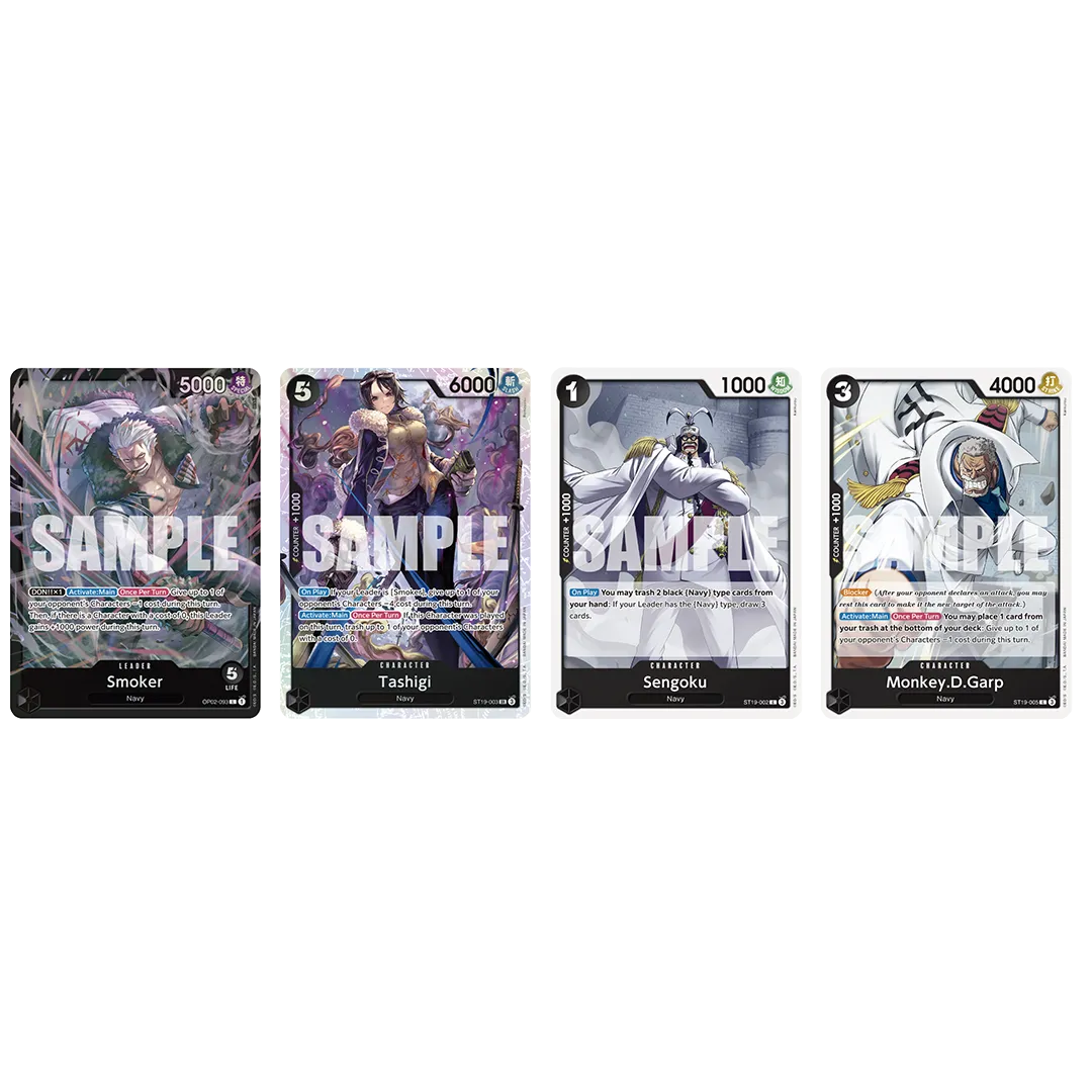 Six colors of Starter Decks featuring Leaders Red Newgate, Green Uta, Blue Doflamingo, Black Smoker, and Yellow Katakuri which are from previous series. Simple Leader effects and color characteristics make this an ideal product for newcomers!