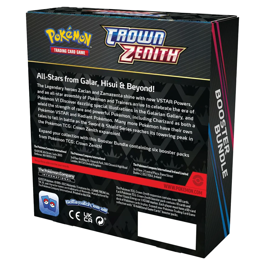 The legendary heroes Zacian and Zamazenta shine with new VSTAR Powers, and all-star assembly of Pokemon and Trainers arrive to celebrate the era of Pokemon V! Discover Dazzling special illustrations in the Galarian Gallery, and wield the strength of rare and powerful Pokemon, including Charizard as both a Pokemon VSTAR and Radiant Pokemon. Many more Pokemon have their own tales to tell in battle as the Sword & Shield Series reaches its towering peak in the Pokemon TCG: Crown Zenith expansion!