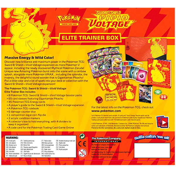 Discover new brilliance and maximum power in the Pokémon TCG: Sword & Shield—Vivid Voltage expansion as more Pokémon V appear, including the newly discovered Mythical Pokémon Zarude! Unique new Amazing Pokémon burst onto the scene with a rainbow splash, alongside more Pokémon VMAX…including the splendor, the majesty, the delightful round wonder that is Gigantamax Pikachu! Put a little color and a lot of spark into your deck or collection with the Sword & Shield—Vivid Voltage expansion!