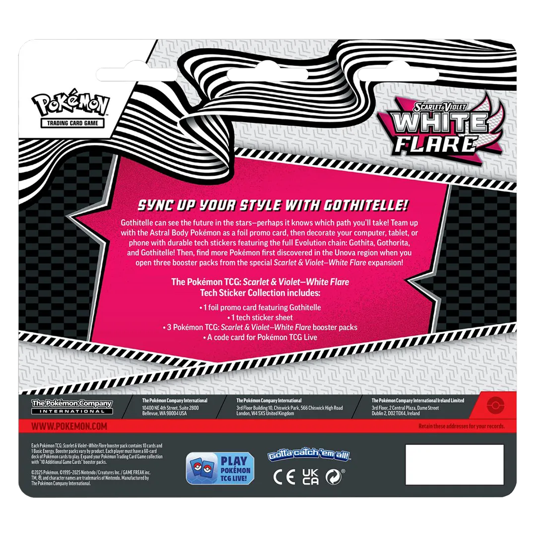 Gothitelle can see the future in the stars—perhaps it knows which path you’ll take! Team up with the Astral Body Pok mon as a foil promo card, then decorate your computer, tablet, or phone with durable tech stickers featuring the full Evolution chain: Gothita, Gothorita, and Gothitelle! Then, find more Pok mon first discovered in the Unova region when you open three booster packs from the special Scarlet & Violet—White Flare expansion!
