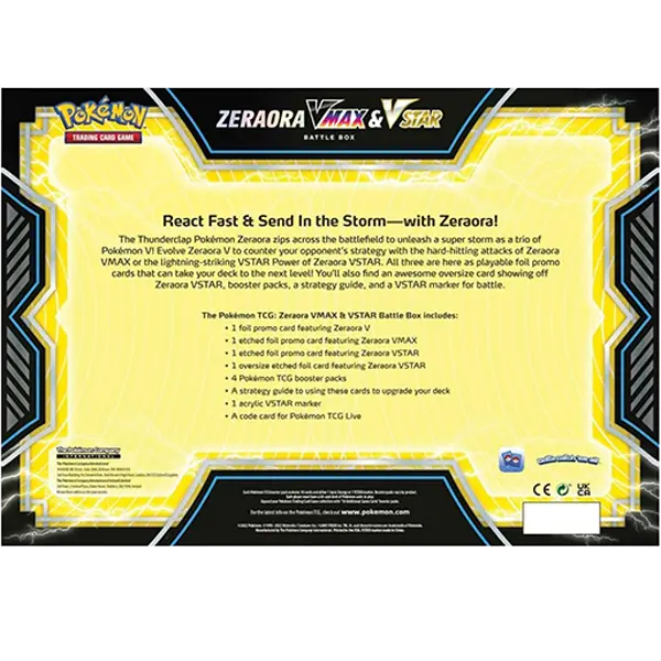 Pick a Mythical Pokémon to stand by your side—each one arrives as a trio of powerful Pokémon V that can take your deck to the next level! You can evolve Deoxys V to harness the high HP of Deoxys VMAX in Defense Forme or the devastating VSTAR Power of Deoxys VSTAR in Attack Forme—or evolve Zeraora V to counter your opponent’s strategy with the hard-hitting attacks of Zeraora VMAX or the lightning-striking VSTAR Power of Zeraora VSTAR. You’ll also find an awesome oversize card showing off the featured Pokémon VSTAR, booster packs, a strategy guide, and a VSTAR marker for battle.